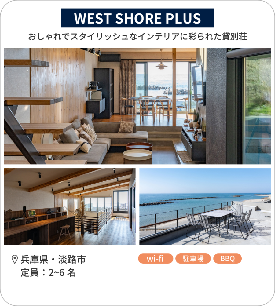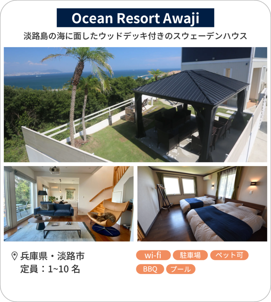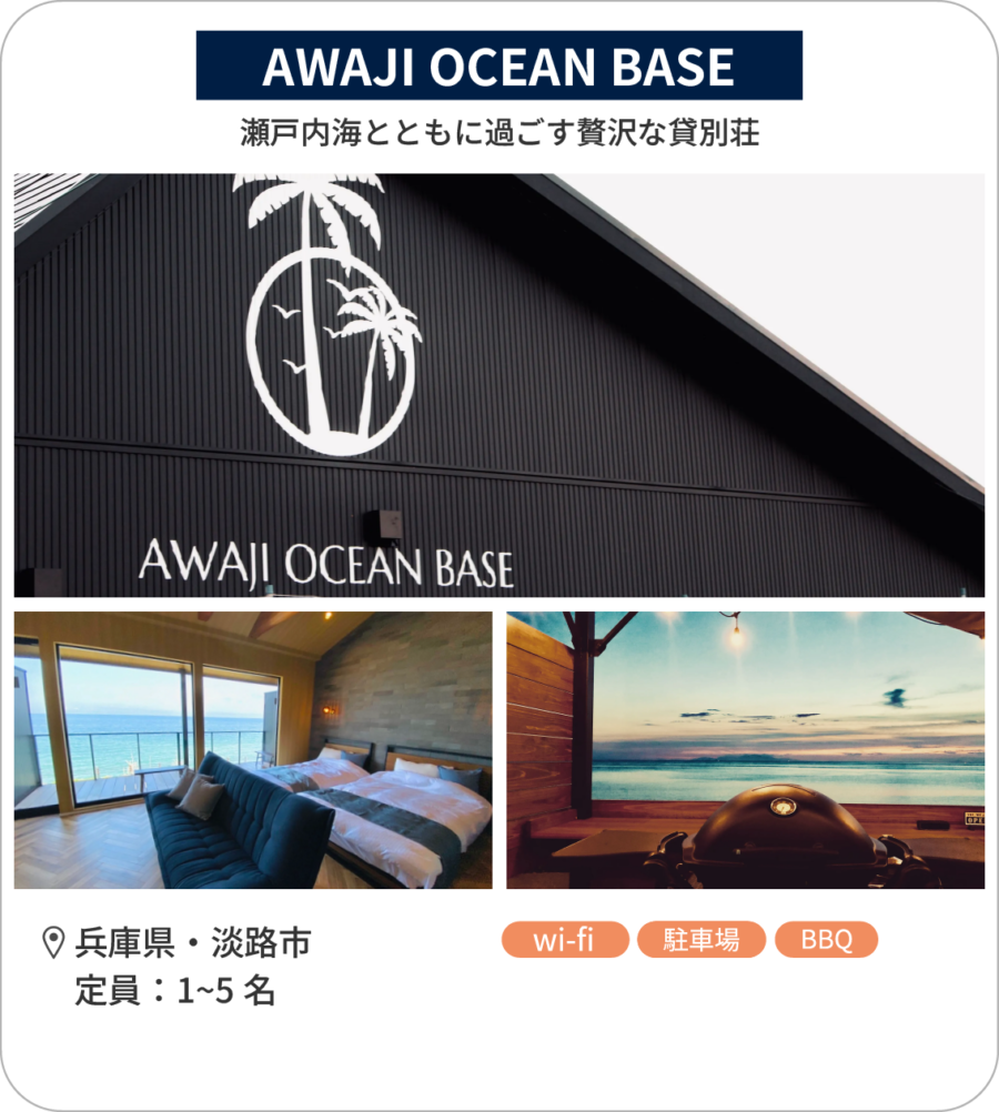 施設を拠点しつつ、淡路島の観光やアクティビティが楽しめるシーサイド貸別荘です。