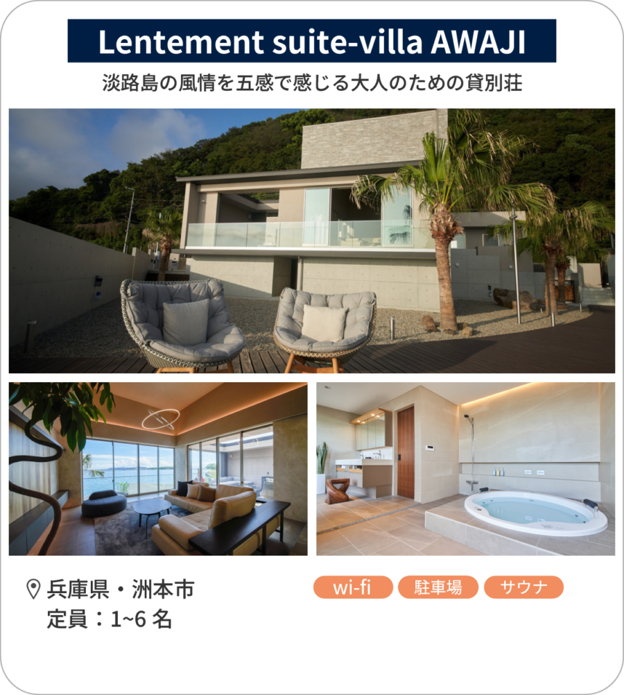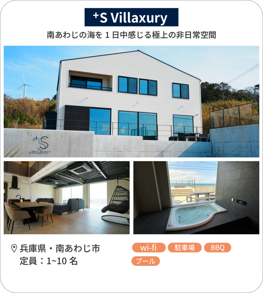 「⁺S Villaxury」は、贅沢な空間と非日常の体験を求める方に最適な貸別荘です。淡路島の美しい自然と共に、特別なひとときを過ごしてみては。