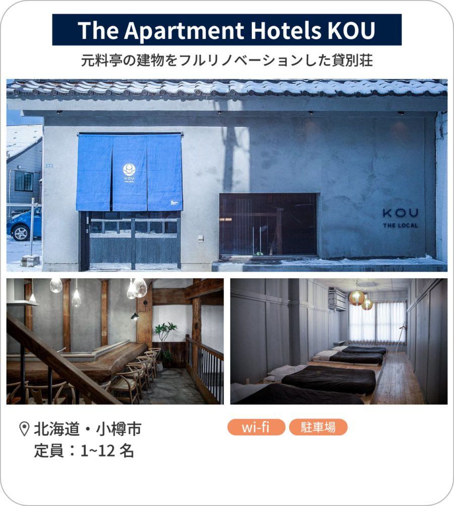 「The Apartment Hotels KOU」は北海道を代表する観光エリアの小樽市内にあります。”KOU”という名前は小樽の魅力の一つである”港”から来ています。小樽市のメイン通りから少し離れた、元々料亭だった建物をフルリノベーションした貸別荘です。料亭時代も船をイメージして内装などが施されていましたが、それを引き継ぎ、船をイメージした照明などのインテリアを設置しています。