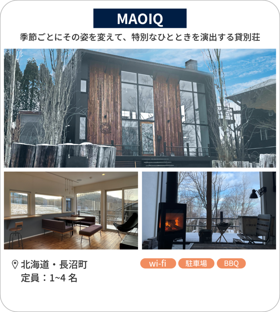 「MAOIQ」は、食器や家具などは上質なもので統一されつつも、北海道の自然を肌で感じられるよう施設自体が設計されています。夜にはウッドデッキでお酒を飲みながら満天の星空を楽しみ、朝にはコーヒーを片手に小鳥のさえずりや朝日が昇る瞬間を眺めるなど、普段の日常では味わうことのできない贅沢を堪能することができます。