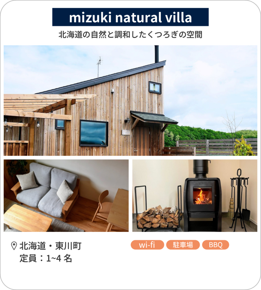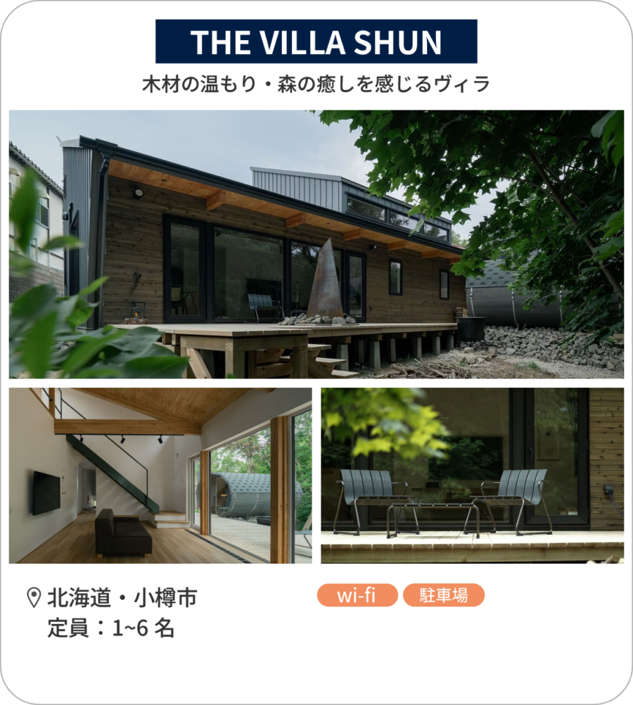 札幌や小樽・ニセコへのアクセスも便利で、北海道の観光を楽しみたい方にとって理想的なロケーションも魅力。森と暮らしの融合を体感できる「THE VILLA SHUN」は、宿泊者の目的に合わせて様々な活用法が可能な利便性の高い貸別荘です。