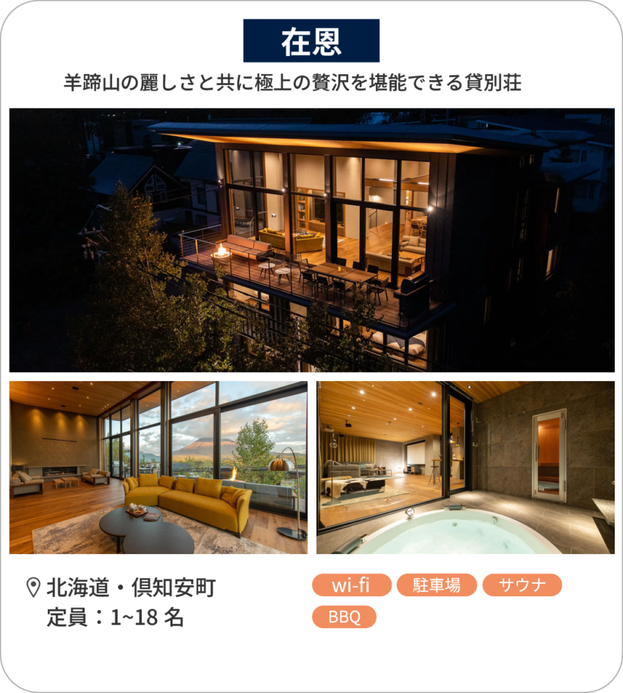 北海道の楽園、ニセコにある「在恩」。この高級貸別荘は、その名の通り、恩恵の中に存在するという意味を持っています。ここには家族や友人と共に過ごす時間への感謝の気持ちが込められ、まさに贅沢なリゾート体験を提供しています。